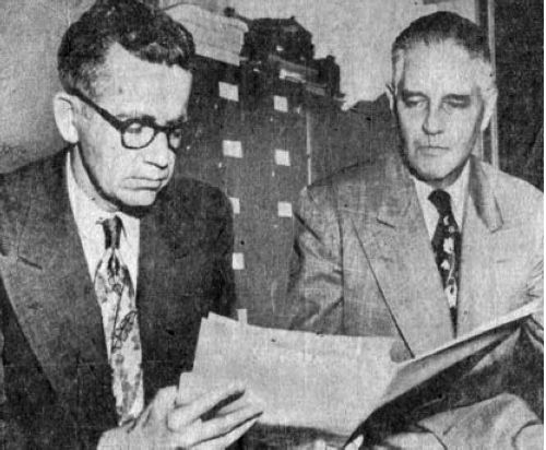 | Kenneth L. Dixon, Managing Editor of the Lake Charles American Press, and attorney Clement M. Moss, during successful defense of criminal defamation charges in 1951, from the Phoenix Gazette |