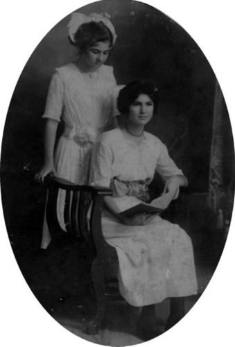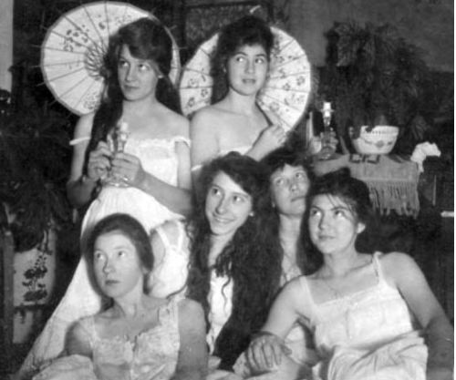 | Swimming party at Prien about 1918 Top: unidentified, Minnie Stewart, Betty Rock, Rosa Hart, Julia Watkins Bottom: Marian Rock, Marian North, unidentified |