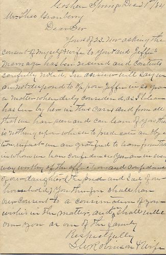 Letter from S. W. Robinson permitting Theo and Jeffie to marry.