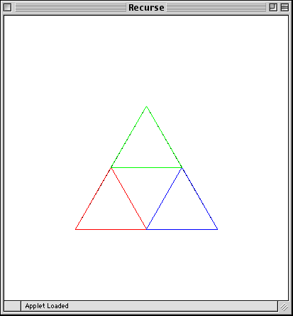The center triangle is then left untouched, but the top, lower-left, and lower-right triangles are further triangulated in exactly the same way until the length of the edges is smaller than 6 pixels long. (In case you are interested, this shape is called Sierpinski's Gasket.)